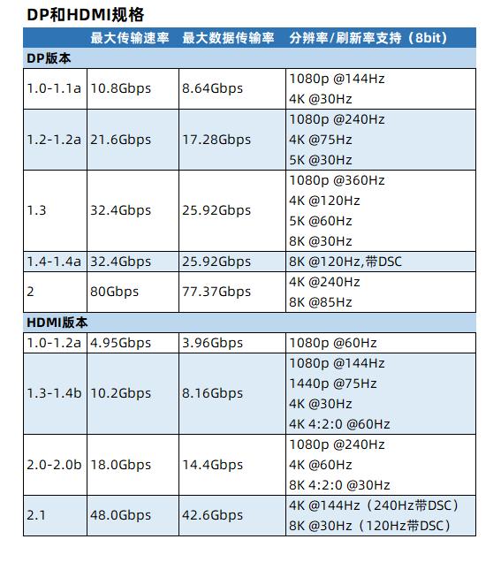 DP、HDMI每一代的協(xié)議版本中最主要的參數(shù)是傳輸速率和數(shù)據(jù)傳輸率。