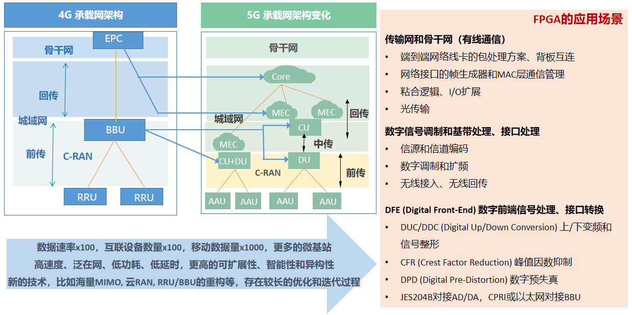 另外,為了滿足5G通信的新需求,海量MIMO、云RAN、新的基帶和RF架構等大量新技術引入其中,而隨著接入設備的增加,大量的微基站也在興起,在網(wǎng)絡應用和運維通過較長時間達到最優(yōu)之前,靈活的FPGA方案被寄予厚望,正在成為各大設備及系統(tǒng)廠商的首選。