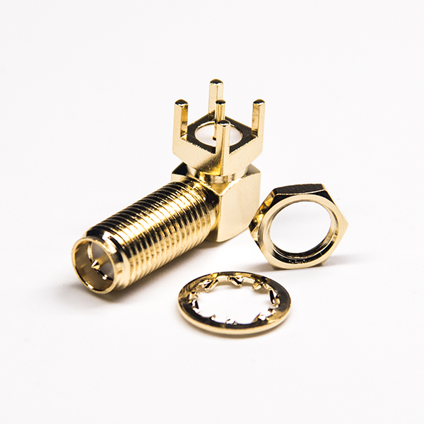 標(biāo)簽:SMA連接器,母頭,90度,插板式,前鎖穿墻,面板安裝,鍍金,50歐姆,反極